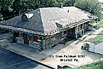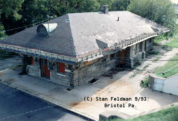 Click here to see the old PRR station at Bristol Pa. This station is at street level below the new Septa Bristol Station on the R-7 Trenton Line. {Amtrak NEC}. It is unknown when the old station was last in service. 9/93.