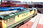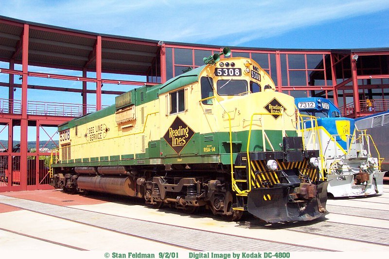 Click here for a Digital Image of Reading Lines (Reading Company Technical & Historical Society) Alco Century 630 #5308. This locomotive was built in September 1967 by American Locomotive Company in Schenectady, NY. It is rated at 3000 Horsepower, has a top speed of 70 mph, and can carry 4,000 gallons of fuel. It was restored by Reading Company Technical & Historical Society members in the Reading Locomotive Shops in 1987. Rail Expo 2001, Steamtown NHS. 9/2/01