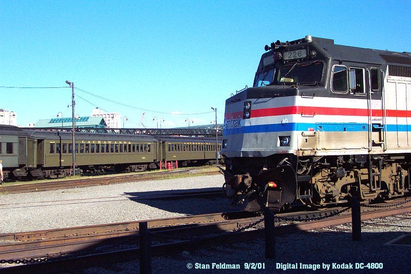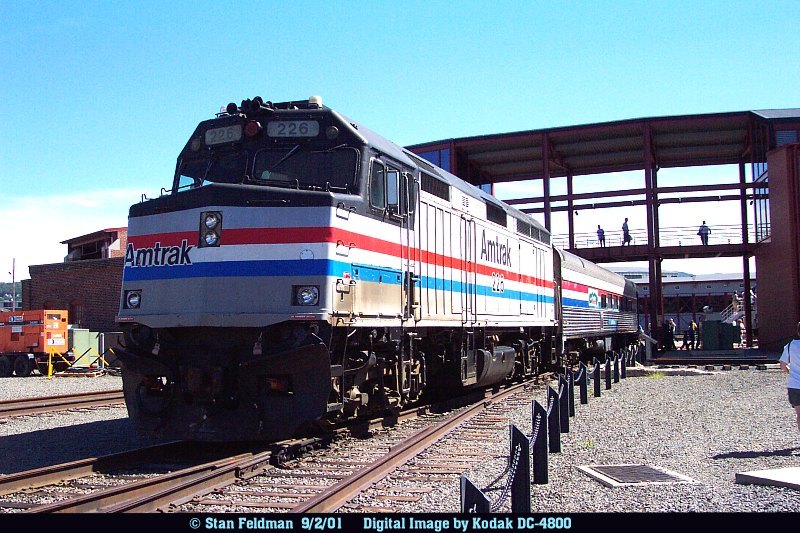 Click here for a front end view of Amtrak F-40-PHR # 226, rated at 3000 HP and built by EMD. In the background are several Lackawanna Railroad Excursion Coaches. Rail Expo 2001, Steamtown NHS. 9/2/01