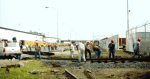 -Click here to see the Union Pacific (UP) Business Car Shoshone derailed on the temporary track leading from Darien street into the parking area near the Comcast Center. This Business Car, built by Pullman in 1914, has 3 wheel trucks and did not ride well on the uneven temporary tracks. If you look directly under the stairs, you can see the wheel sitting outside the rail. Phila. Pa. 7/23/00