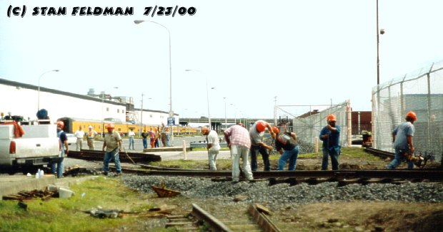 -Click here to see the Temporary track being repaired. After all the trouble with The Union Pacific (UP) Business Car Shoshone, it was decided to realign the track before moving more office cars. Philadelphia Pennsylvania. 7/23/00.