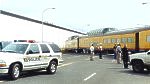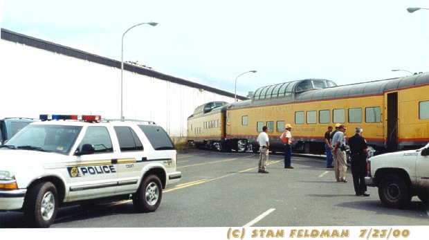 -Click here to view Darien street, as work continues to push the Union Pacific Office Cars into place. The vehicle on the left side of the picture belongs to the CSX Police. 7/23/00.