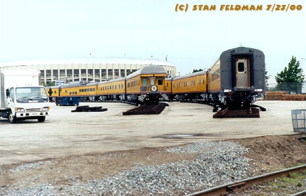 -Click here to see The Union Pacific Business Cars on the Temporary track near the The Comcast (First Union) Center. The track leading to the parking area has been removed. The cars will be used to entertain and feed the delegates to the Republican National Convention. In the background is Veterans Stadium. Phila. Pa. 7/23/00