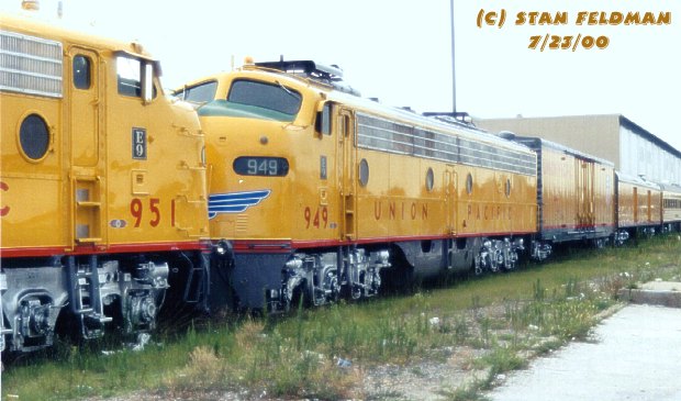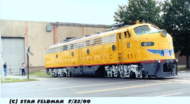 -Click here for a rear look at Union Pacific E-9 #951. The engine was refueled on the other side of Pattison Ave. and has just been moved back to the rest of the train on Darien street. Philadelphia Pennsylvania, 7/23/00.| Click here to Search Stan's RailPix ! |