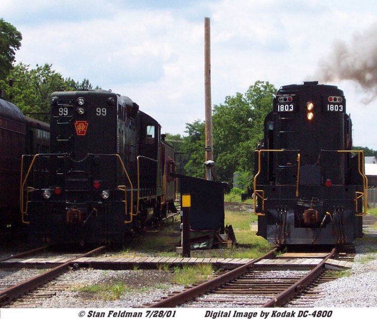 -Click here for a side view of West Chester Railroad GP-9 #99. This locomotive, painted in PRR colors, was bought from the Ohio Central RR in 1997. It was one of the engines featured in a Night Photo Ride on the West Chester Railroad on Saturday August 25, 2001. Digital Image by Kodak DC-4800. West Chester Pa. 7/28/01.