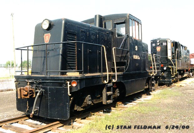 -Click here to see West Chester Railroad 65 ton #9, built by General Electric in April 1941 and rated at 350 HP. This engine, ex-USA #7079 is seen in the Yard near the West Chester Station, West Chester Pennasylvania. 6/24/00.
