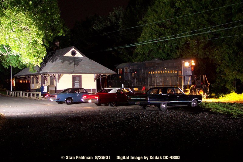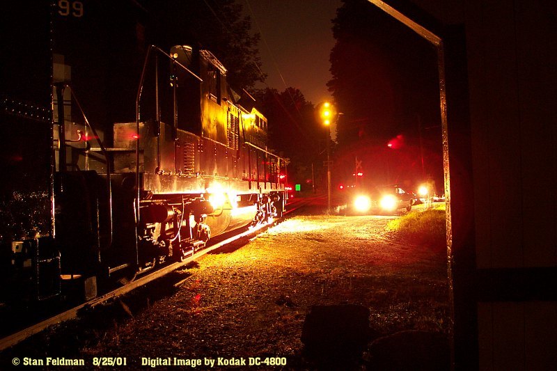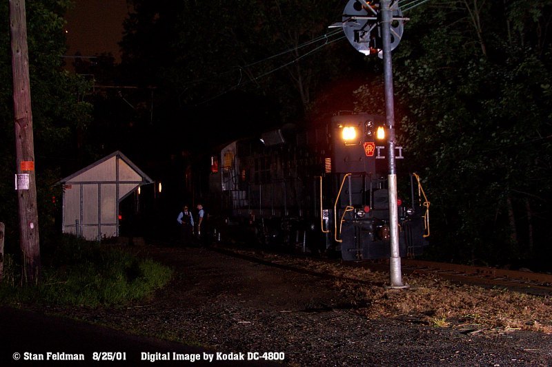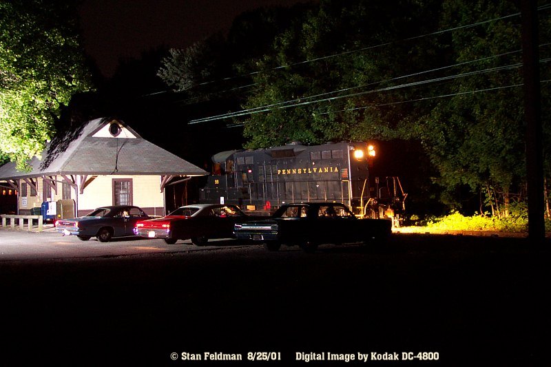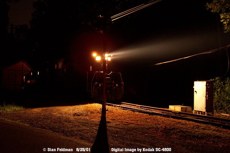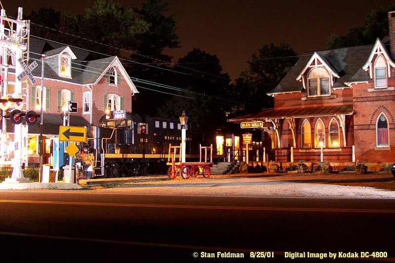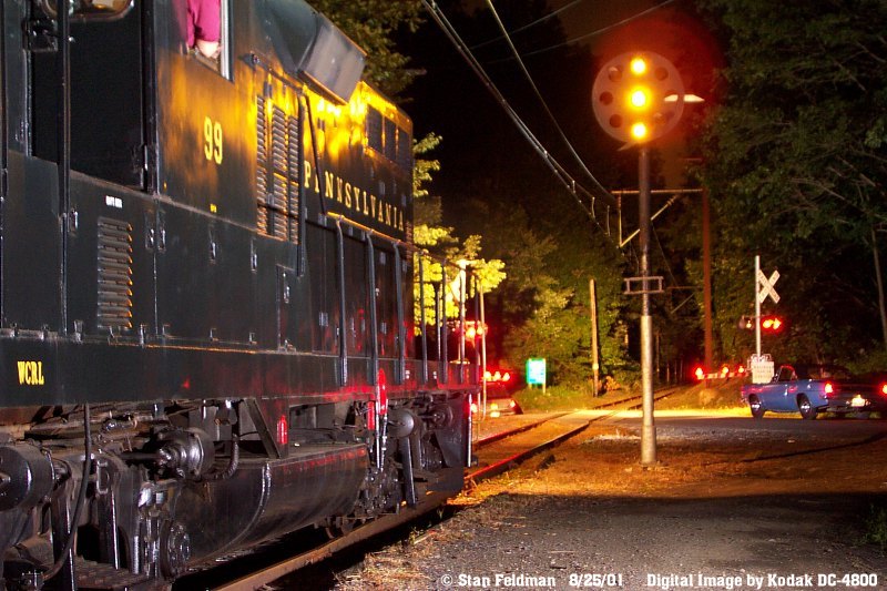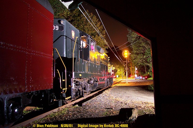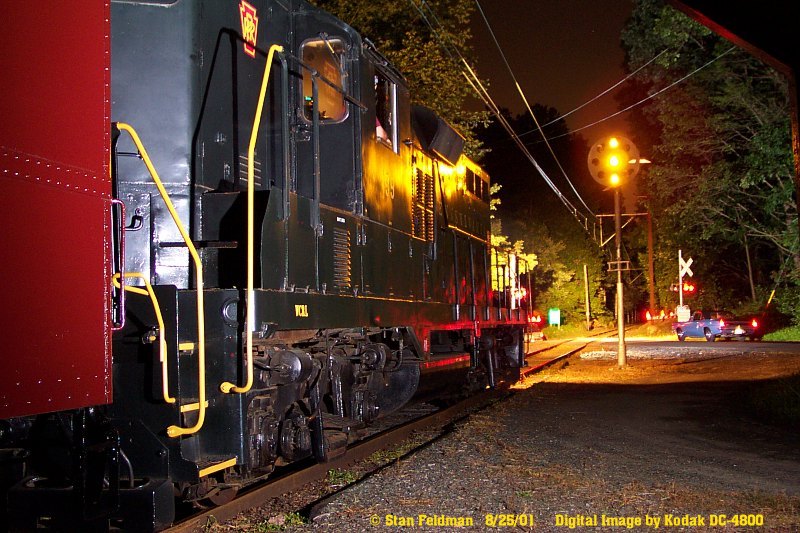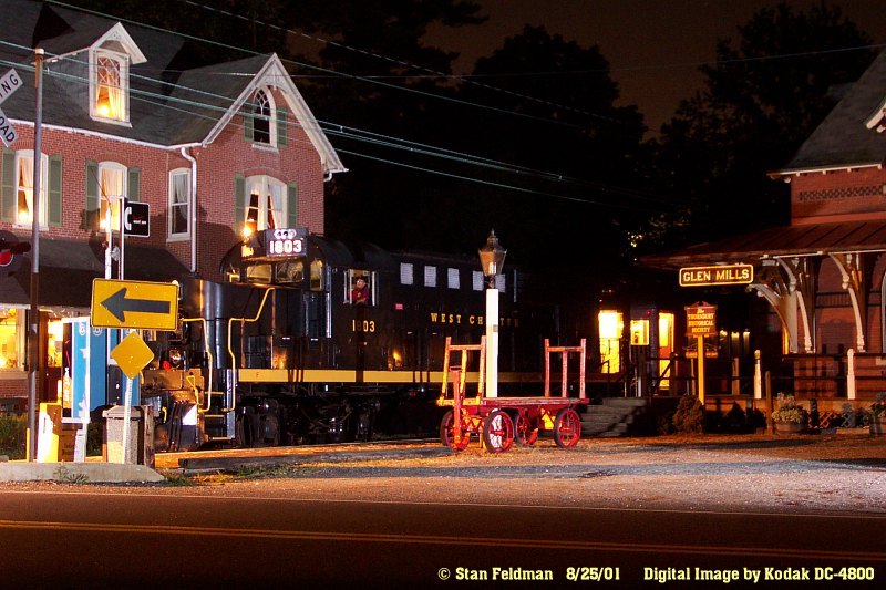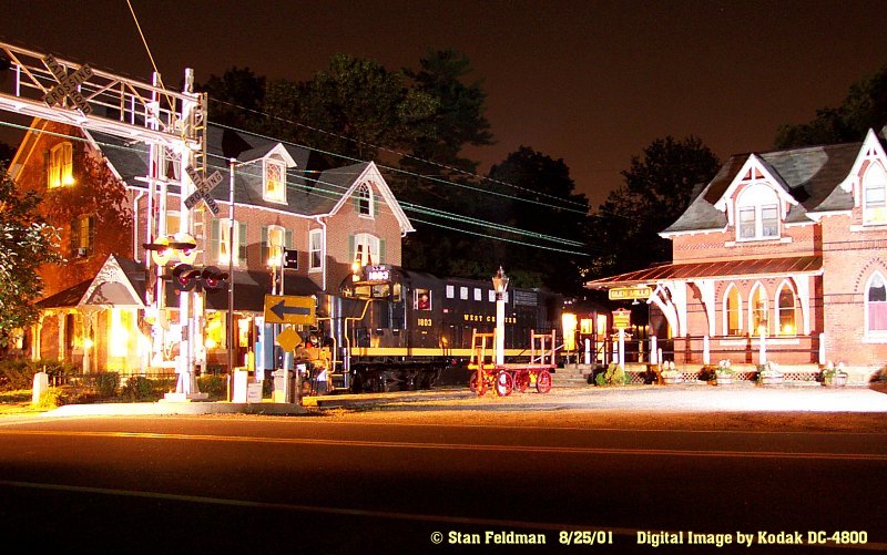 On August 25 2001, a Night Photo Ride was held on The West Chester Railroad, starting at The Market Street Station in West Chester Penna. Kermit Geary Jr. directed the night photo shoot and provided Lumedyne lighting with the help of Fred Jones. I would like to thank WCRR President Mr. Joe Giacchino and the entire friendly crew at the WCRR. A special thanks to WCRR Conductor Ken Petonke, who took the time to arrange access to the Locomotive cabs, and for providing information about the railroad and passing landmarks.