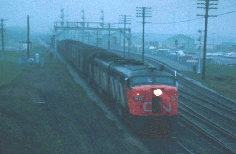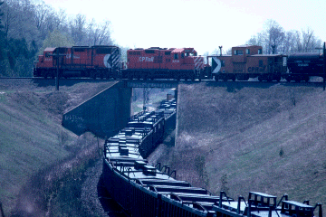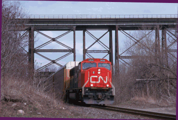 BEARE - East of Toronto Yard, the Belleville Sub crosses over the CN York Sub at Beare Road. This spot is at the upper end of Meadowvale Road, northeast of the Metro Toronto Zoo. Take Meadowvale north to its end at Plug Hat Road, then go east on Plug Hat Road, then go south on Beare Road to the CP tracks. There is room to park on the dirt trails on either side of the CN line. The bridge is a short walk from the road. This area is not patrolled frequently, but stay well back from the tracks in any event. While relatively crime-free, this area is secluded and attracts a fair amount of after-dark activity, mostly teenage partying and amour. Use caution in the wee hours.