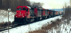 HORNBY - CP's new Expressway Service Intermodal terminal is found here. Expressway trains on the Hornby- Montreal and Hornby-Detroit runs originate and terminate here. West of the terminal is the well-known "Hornby Dip", where tracks descend a steep grade and then rise again into Milton. The level crossings in the back roads between Trafalgar Road and James Snow Parkway offer some pretty shots.