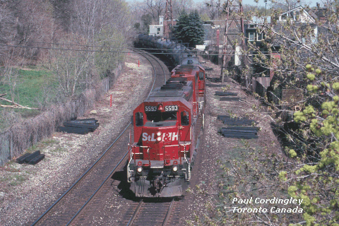 The North Toronto Sub is a busy line carrying all of CP's traffic to and from western gateways. Because of the urban environment, much of the North Toronto Sub is considered a "no parking" zone....so the RTC keeps 'em moving! Frequently, track work limits movements to single track across the city. This only serves to space out the action and keeps the fun going all day long.