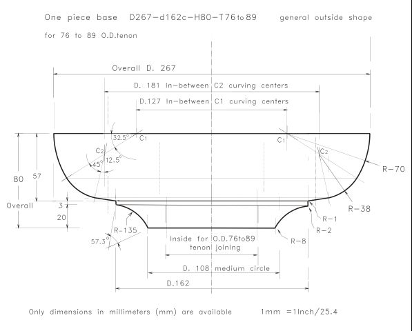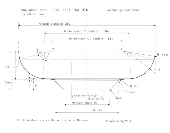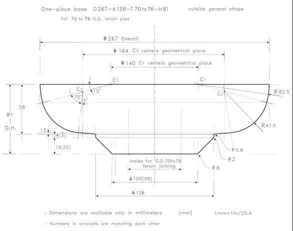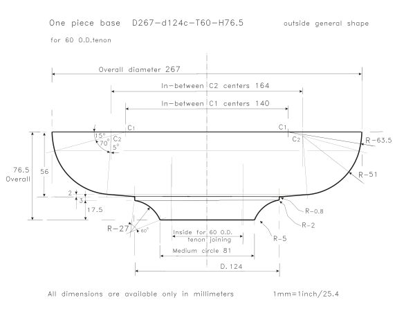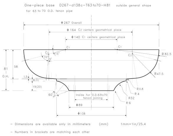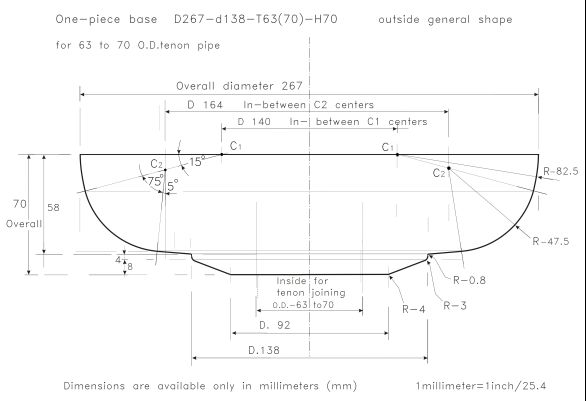 Support-Base outside shapes The drawings exposed below may help designing or redesigning 'One-piece-base' starting from the outside (exterior) shape and dimensions. The design of these pieces may be continued in any way, only if the outside (lateral and below part) shape, and the in-going of tenon (pole top end) diameter interval, are preserved. Pieces may be also used in other kind of applications. |