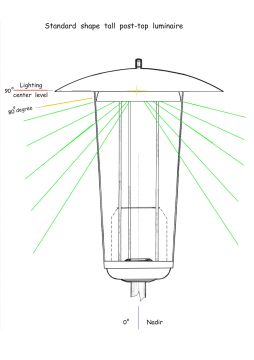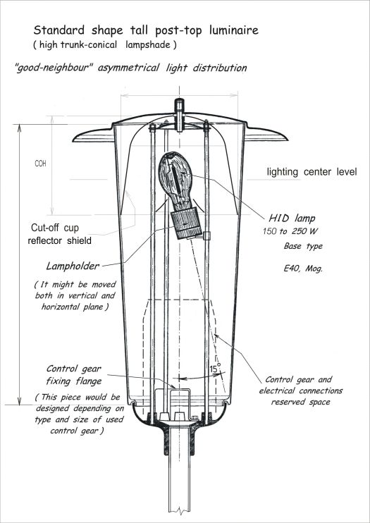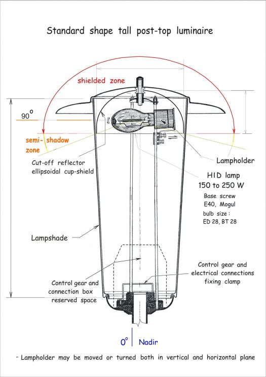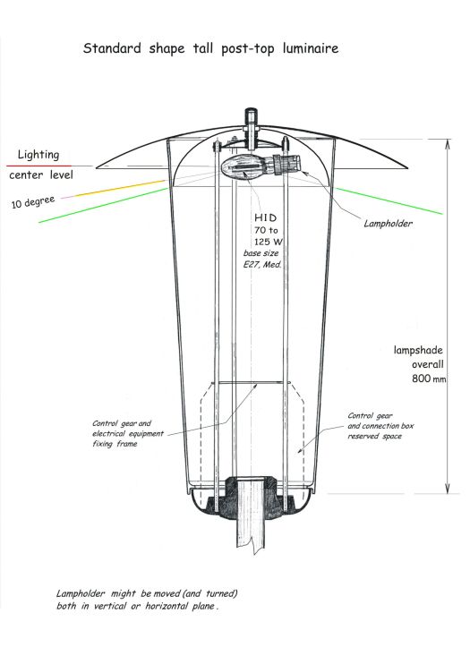This is true for the completely assembled luminaire with lampshade and cut-off shields included during the evaluation . Optimal luminaire mounting height - 3.35 to 3.65 meters or 11 to 12 feet up to pole's tenon . Solutions for luminaries interior designCutoff and other optics ( interior surface of lampshade ) may be designed according to lamp wattage and lampholder position within the lampshade, for being optimal at this mounting height . The most required Cutoff level is "Full-Cutoff", or "Full-shielded". The large interior space allows a lot of cut-off shields combinations. So, for a "good-neighbour" usage, cutoff shields may be unsymmetrically designed not to allow the light emission to a nearby neighbourhood where the light is not allowed. If a lower vertical (base down) burning position of lamp is chosen, both control gear and lampholder may be fixed on the fixing frame. If a higher lamp burning position, or lamps having "base-up" burning position are chosen, it is required the lampholder-fixing-flange fixed on one of the rods. A highly efficient low pressure ( "horizontal" burning position ) sodium lamp may be used both for common or asymmetrical cut-off shields. A compact fluorescent lamp is also suitable for this kind of luminaire. All kinds of HID ( mercury, sodium, metal-halide ) lamps ( having "base-up" and "base-down" burning positions ) are very suitable. Fixing flanges are designed to join E27, E40, Medium or Mogul lampholder, or those for SOX or compact fluorescent lamps ( BY22D , 2G11 ). Other new kinds of lamp ( cold-kathode, induction lamps…) may be used too. The large interior space of lampshade allows the use of the lamps (bulbs) with asymmetrical light spreading, especially for "good-neighbour" lighting. Examples of interior design- cut-off shields, kinds of lamps, lampholder positioning, control gear ( ballasts, igniters, dimmers,… ) and electrical connection reserved space. |
