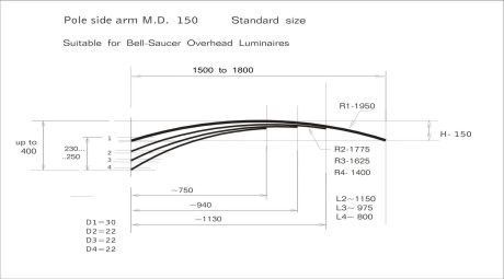 Length=1500...1800mm. Applicable on concrete, or metallic poles of any sizes or shapes. Suitable luminaires : 'Bell-Saucer' of medium or large size. |