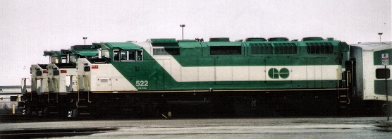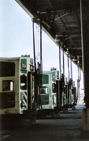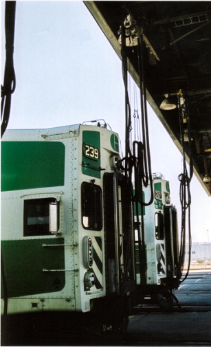 East End Yard facilities now includes a modern locomotive wash just opposite VIA Rail's service track building. (VIA's consist wash is the small building north of the main shop towards the west end.) A run-around track exists on the north and south sides of the yard. North is Track 1 and is joined by F1, F2, and F3 just east of the wheel bay; South is 16E/W. Track 1 is on the north side of the change off platform behind the wall and it and F1 are used for inservice consist change offs. There is an accessible platform on the change off platform - the first operational one on the system. Although F3 is normally used only to access the PM and wheel bay it does join Track 1. There is a very sharp bend just east of the sand tower that has been known to derail cars, the max speed through the curve is 2MPH. Track 1 continues west through the yard and passes south of the consist wash to Canpa. Tracks 7E to 15E are reserved for wayside power (cab cars) opposite the control centre. 6E is a paved fire route and only used to dispatch 6W. The diesel inspection shop (DS3) took away the former roadway. Click button images to open a new window.