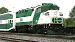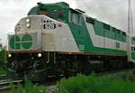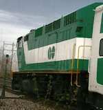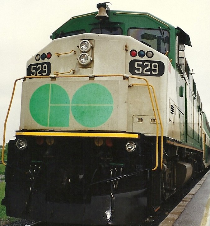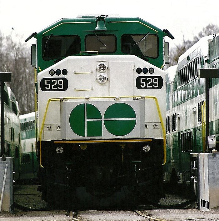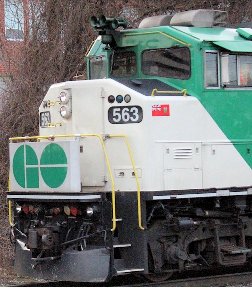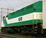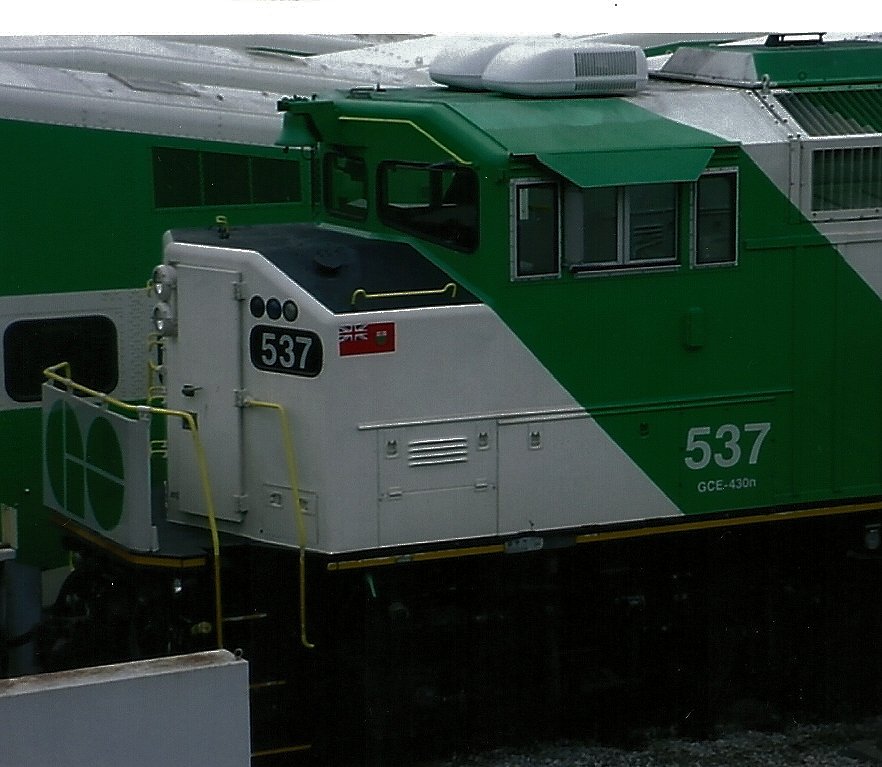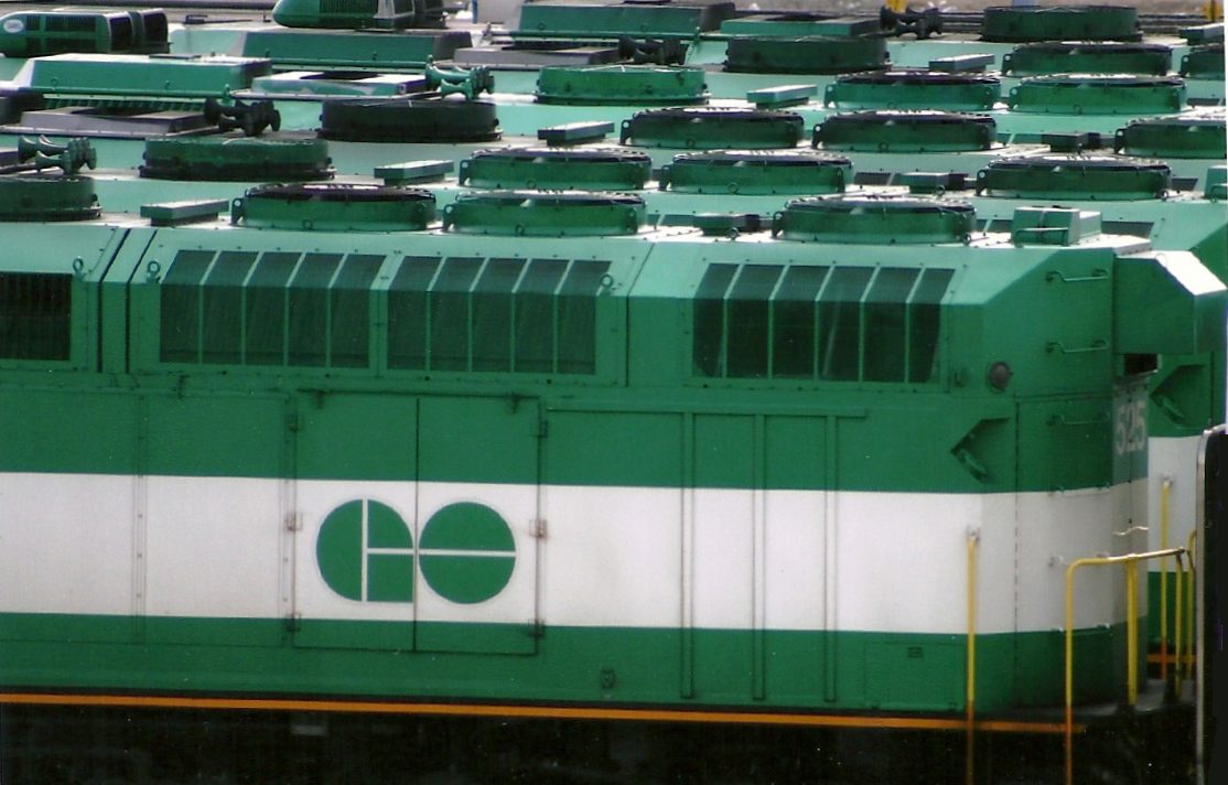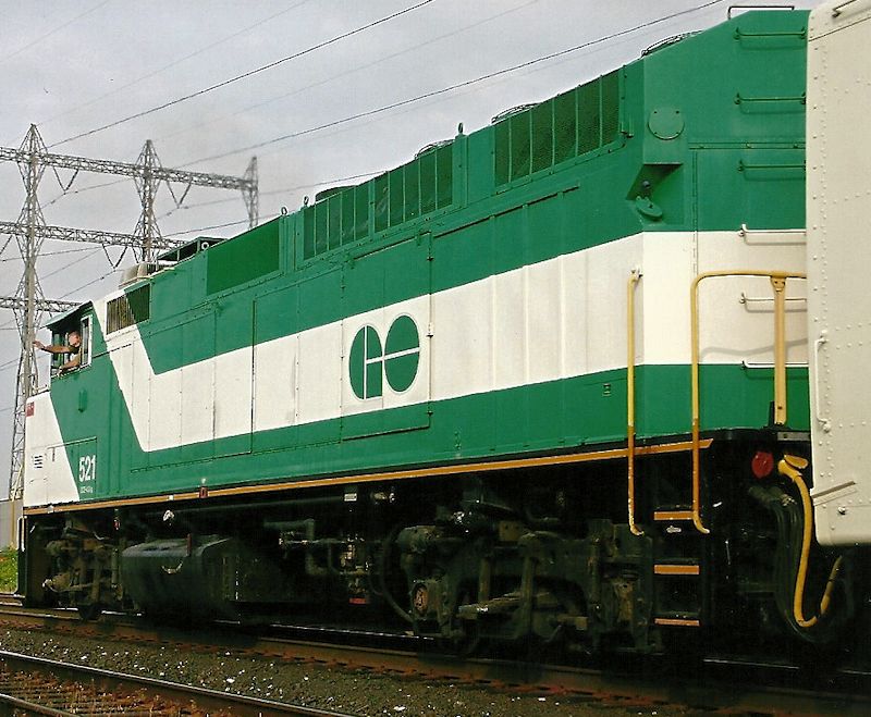 | . The GO Shield on front handrails - throwback to first GP40TCs which once carried the logo and a Destination Board | . Continued use of original 1967 GO logo and green and white paint scheme and the white hockey stick logo on each side panel to roof | ||