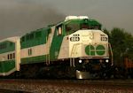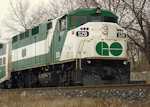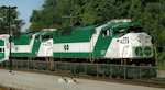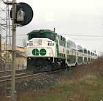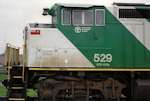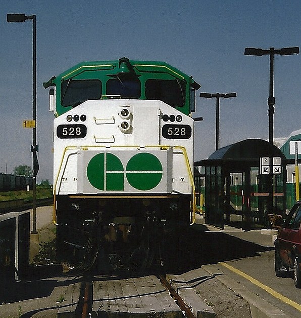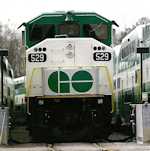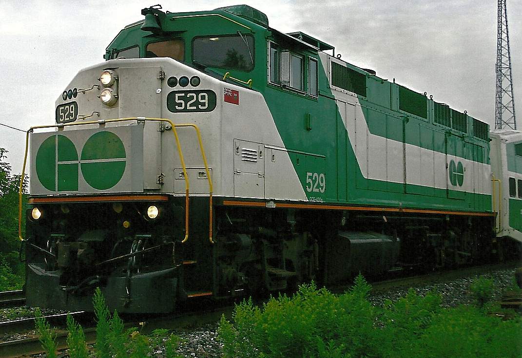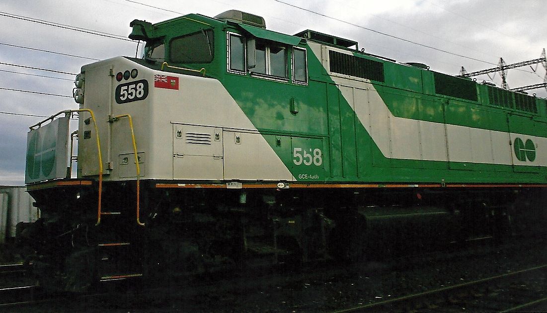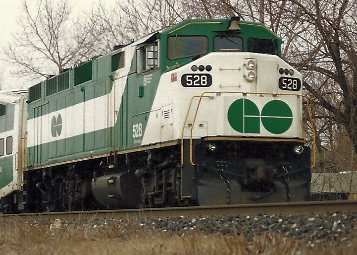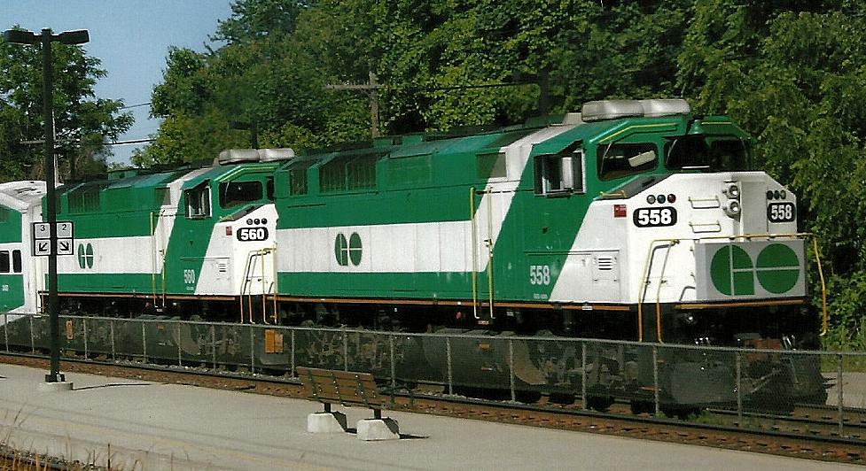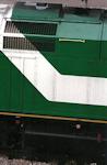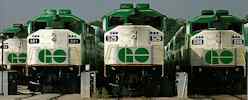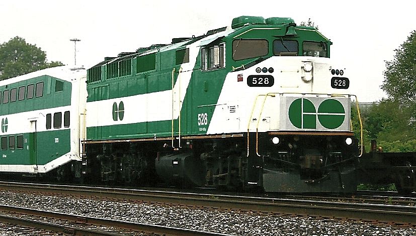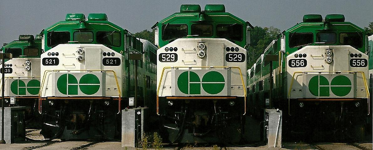| . The GO Shield on front handrails - throwback to first GP40TCs which once carried the logo and a Destination Board | . Continued use of original 1967 GO logo and green and white paint scheme and the white hockey stick logo on each side panel to roof | ||