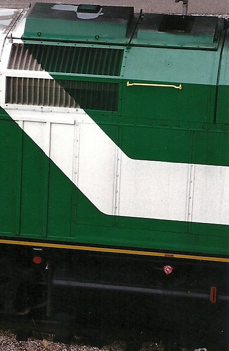 | . Whistle - original location (1988) side mounted on the fireman side on the slanted upper frame beside the removable turbo exhaust silencer hatch; by August 1990 on all units, the whistle was relocated and centre mounted on the long hood directly in front of the dynamic brake blower fan and behind the turbo charger stack; the hole left by the whistle relocation was handled in three ways: (a) temporary lift ring plugged the hole (eg) 529; (b) temporarily leaving empty whistle mounting bracket in place (eg) 528, and (c) all units eventually received a small circular metal cover plate over the hole (some painted, others unpainted until regular servicing) (eg: 532 Note disk plate above grab iron) . 533 last to have whistle location changed | ![]() 532 removed whistle plate | ||