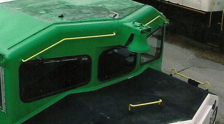 | . Addition of two Recreational Vehicle-like air-conditioning units affixed to the cab roof top and a temperature control installed in the cab. Of note, 520-564 now utilize the new AC units. The box-like AC units first installed and tested in 2001 on 537, 538, and 539 were removed between November 2004 and June 2005 and replaced with the newer AC style | . first GPS antenna on cab roof 538 (testing began summer 2004) (eg: 538 GPS antenna) / (eg: 538 Closeup of GPS antenna) | ![]() 538 GPS | ![]() 538 GPS Close Up |