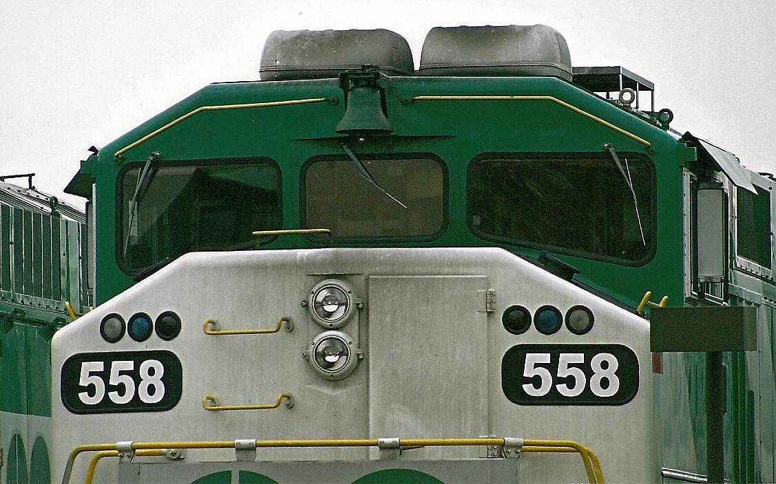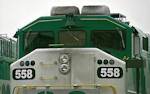 | > 557-564 have electronic bell on front of short hood (brass bells gone) and whistle on top of the EB now (2015) | ![]() 557-563 New Bell/New Whistle Location | |