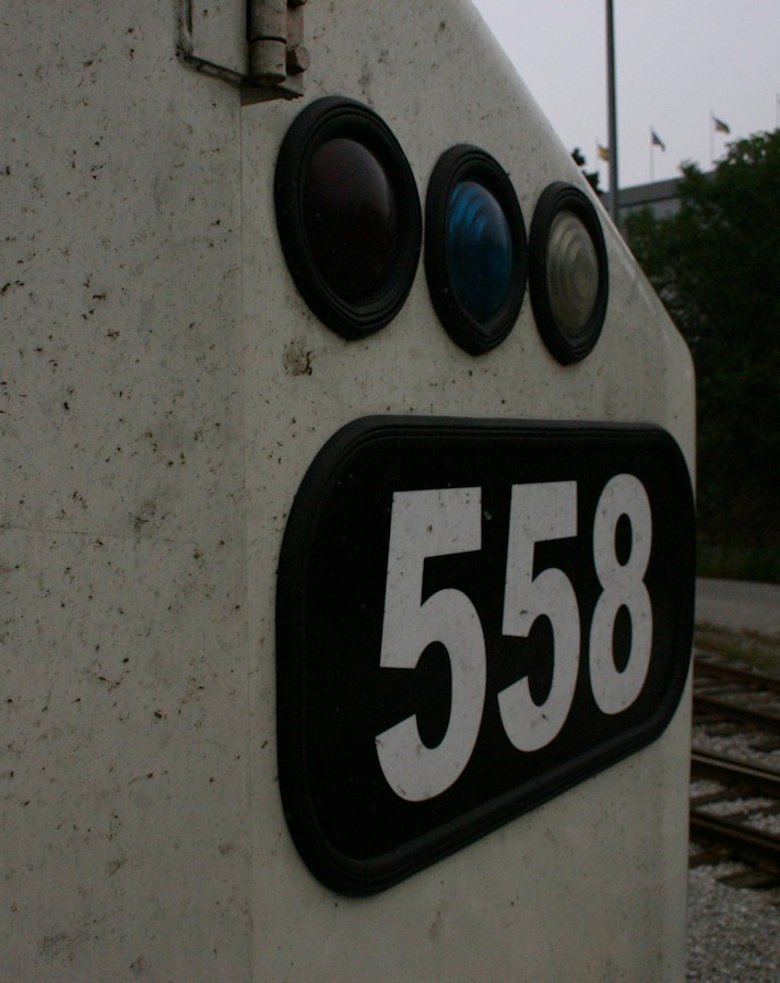 | > current number boards (2002 to current) - two styles depending on when the 2P servicing was completed and units returned to service: (NOTE: original number boards on 536-564 (1989-2002) the same design as on original 520-535; all changed out during 2P service to current description; no original number boards now displayed on 536-564) | ![]() 558 New Number Board | |