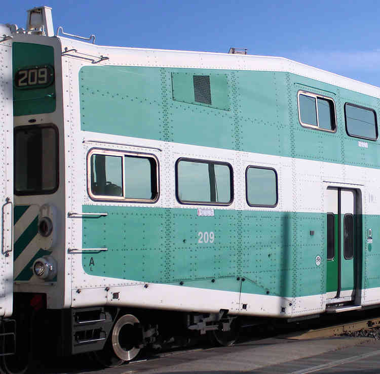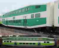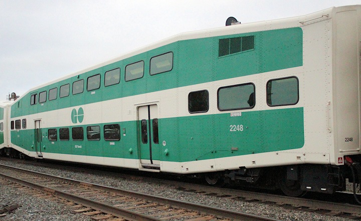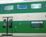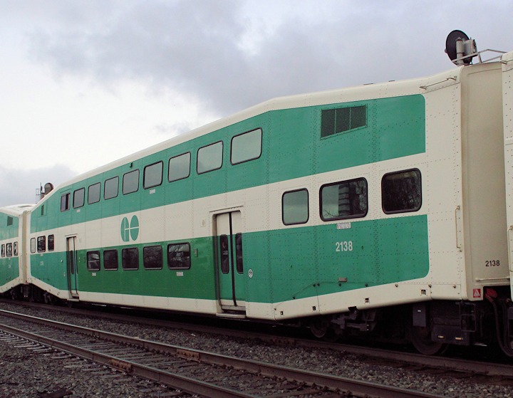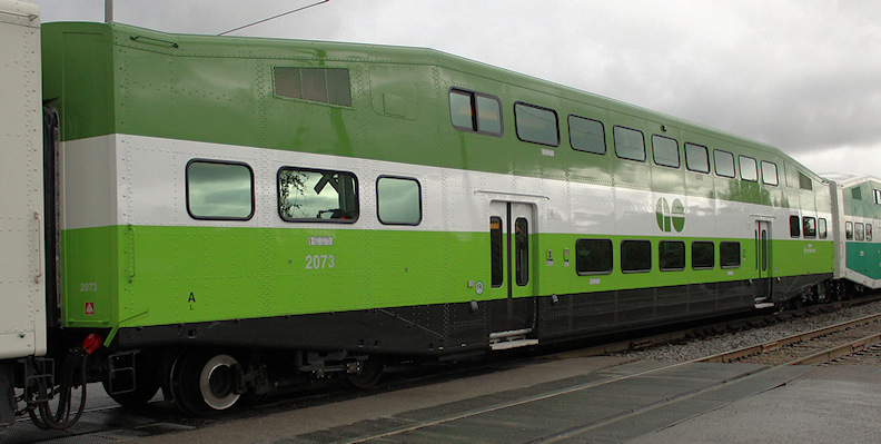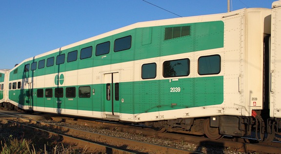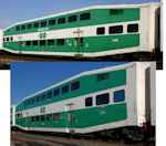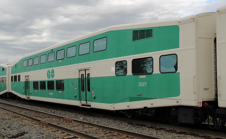 GO 2039 - Last bi-level refurbished by CAD in Montreal - equipped with fabric seat cushions & work tables with a power supply for lap tops. Soon GO will start a refurbishment program on all of the Bi-II cars in one contract. The Bi-I refurbishment was done in two contracts. |