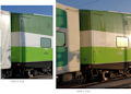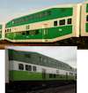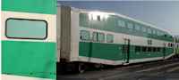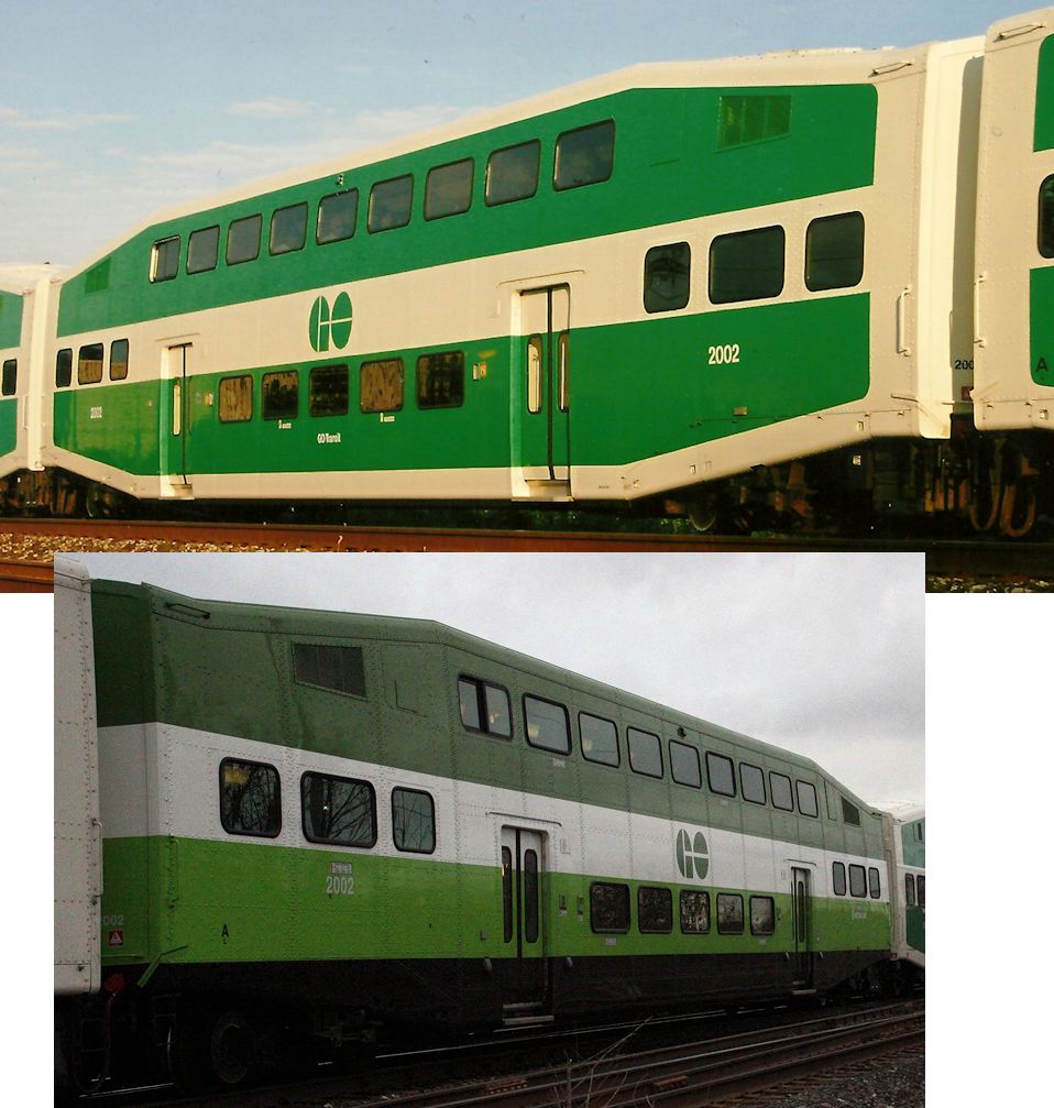 GO 2303 (top) as a paint chipping accessible 30 year car with the Bombardier decal (bottom) A fully repainted no-longer-accessible coach, new door step lights, redecaled with GO Transit replacing the Bombardier (same location) (Note: all 2300s Series IV coaches now non-accessible, redecaled GO Transit) |