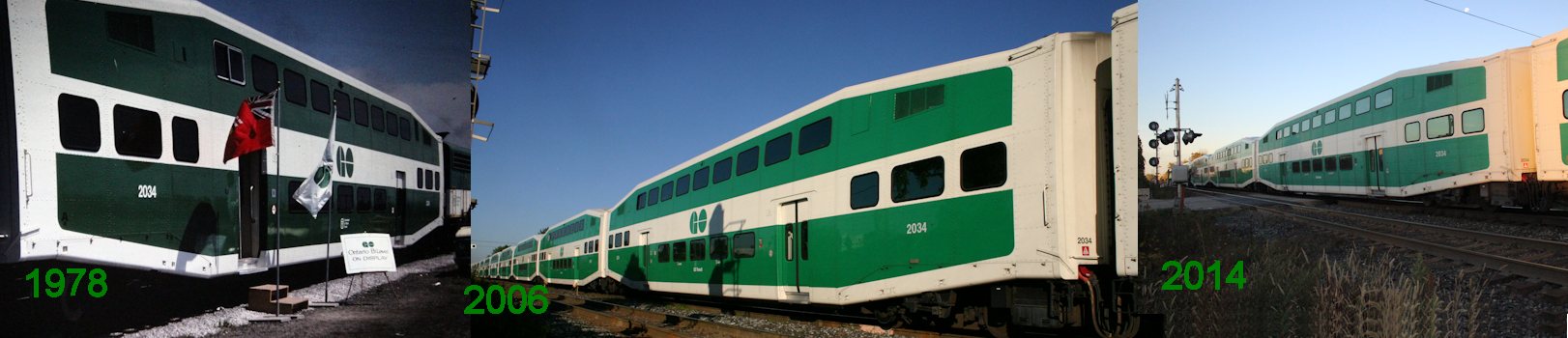 GO 2034: in 1978 brand new, Province of Ontario and trillium logo, no AEI etc / in 2006: newly repainted, GO Transit now, AEI / in 2014: fading paint |