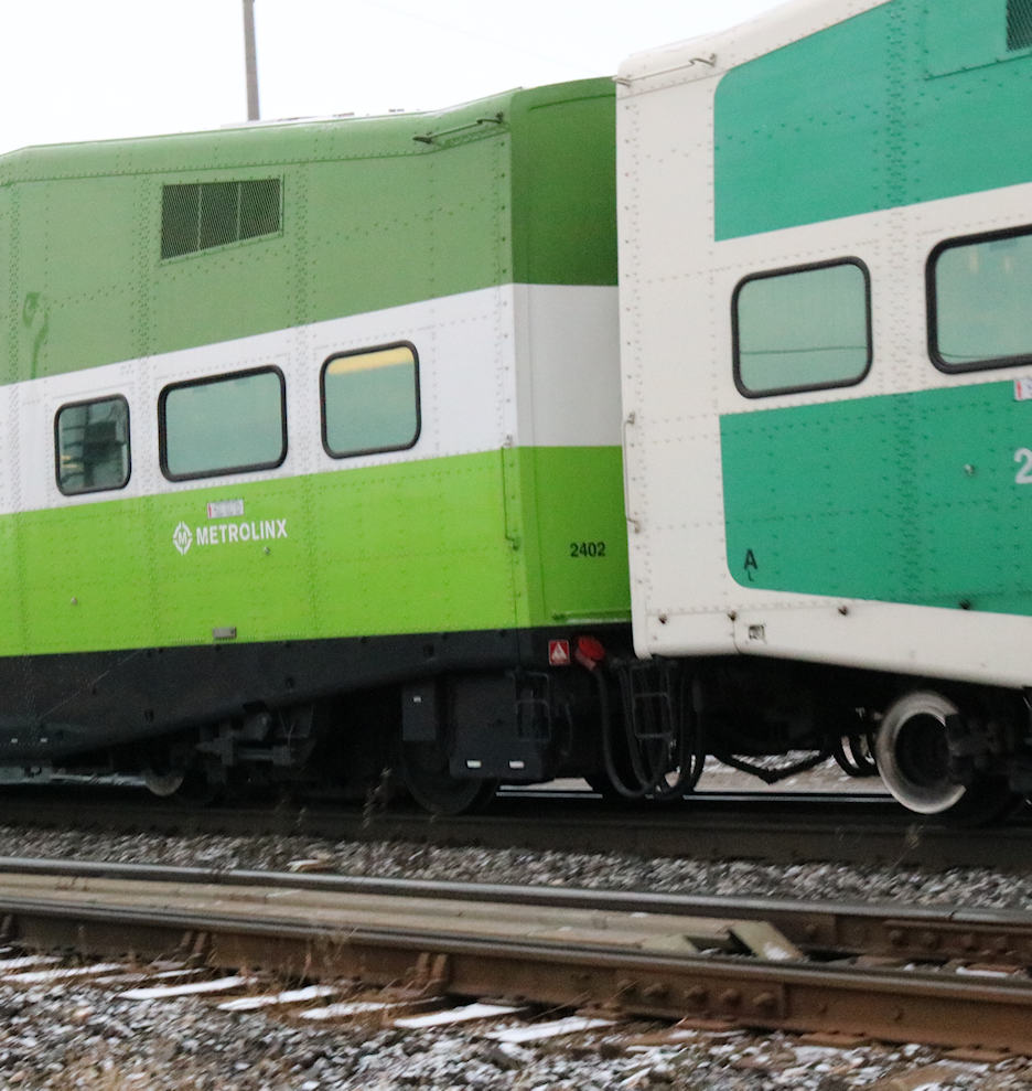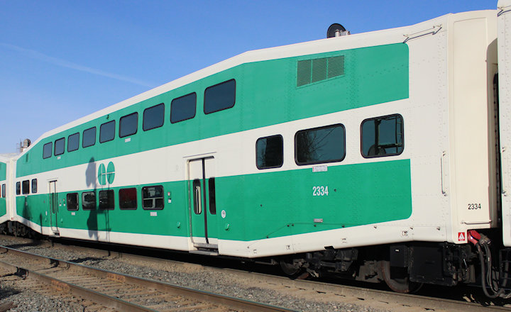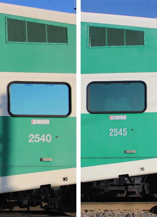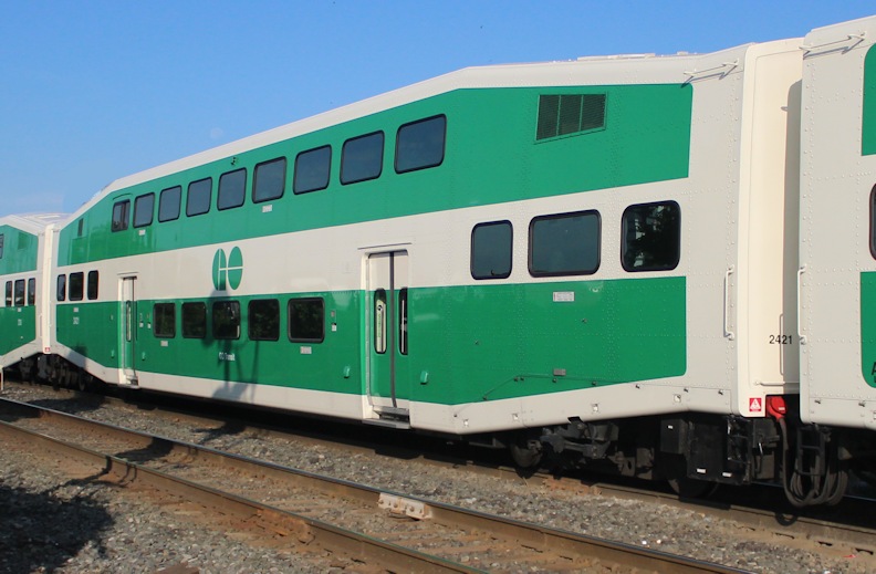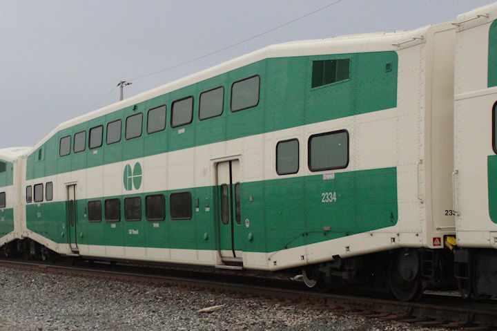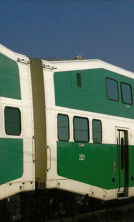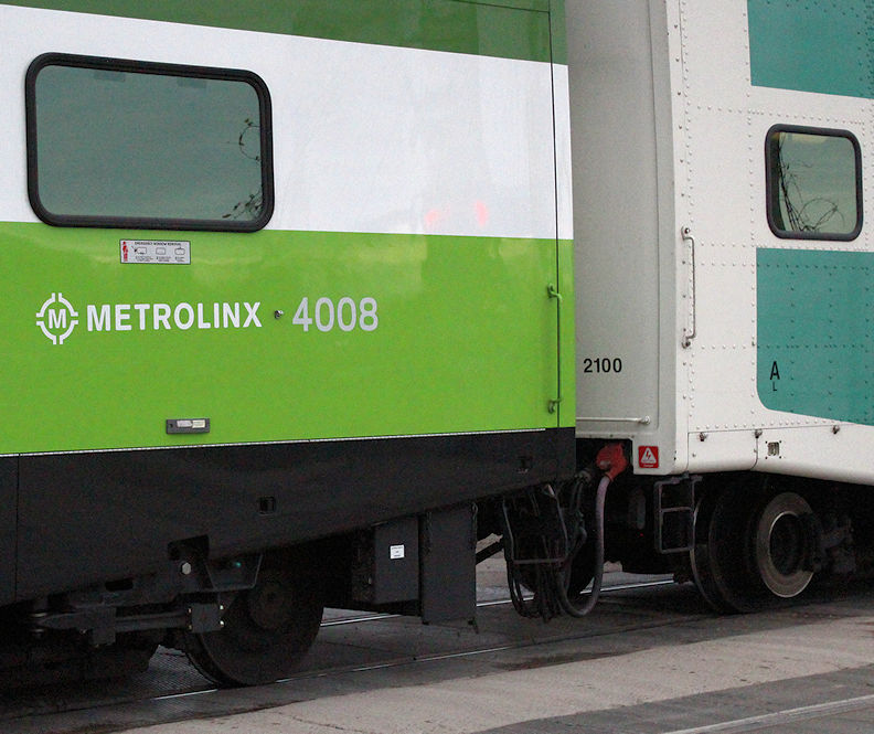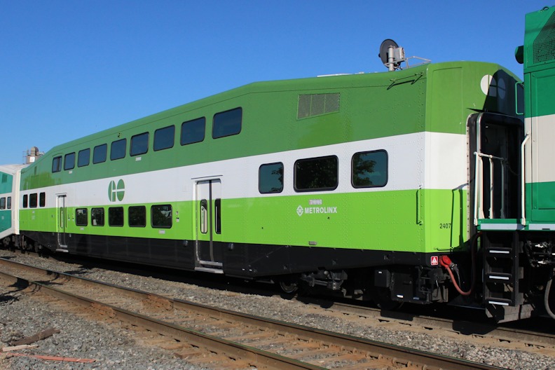 |  The new paint scheme does not have the coach/cabcar numbers on the sides, 'B' end. Under some lighting conditions it is also very difficult to see the coach/cabcar numbers and 'Metrolinx' because of the new paint scheme contrasts; bulkhead numbers white EXCEPT: 2402 and 2407 below