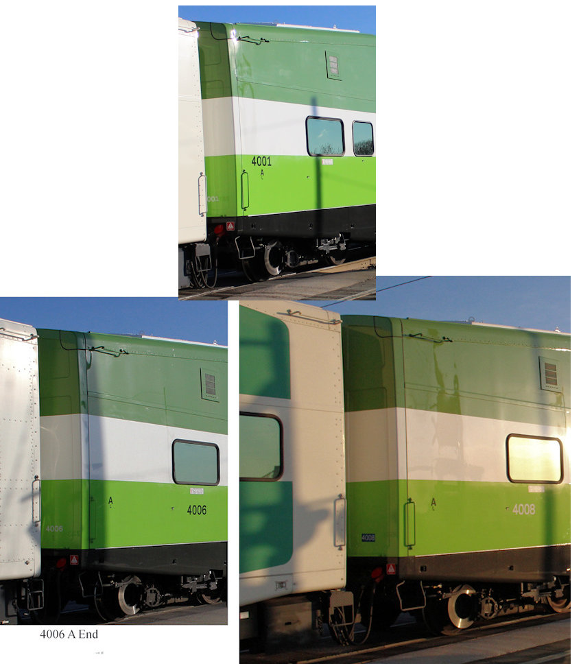 Newest GO coach #4000 (Jan 2017) - note black numbering (easier reading) located on the A end side of coach . numbers not centered under the window . windows now 9/4/4 . NO bulkhead numbering on A end of 4000 only (so far!) |