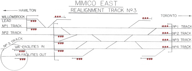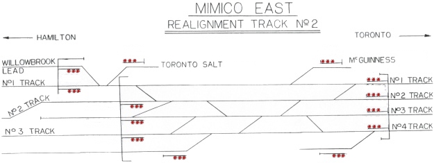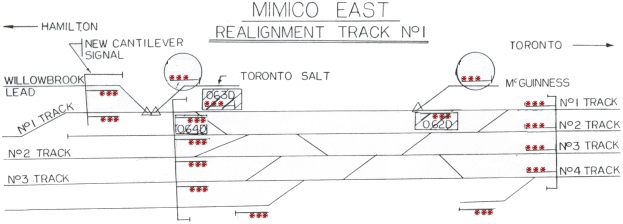 A part of the changes around Union Station were also further west at Mimico East, and the leads into GO's Willowbrook Yard, and VIA's Toronto Maintenance Centre (TMC). Beginning on Monday, 02 November 1981, Tower "B" at Mileage 8.2 Oakville Sub was demolished by a private contractor. It took three days to completely tear down and remove the once time honoured facility. Later, on Monday, 09 November, Tower "A" located at Mileage 6.9 Oakville Sub was also demolished. It took three days to completely remove this tower. CTC changes and automatic dual control switches were also badly needed at Willowbrook and TMC to prevent delays in and out of the two yards. On Friday, 14 June 1985, these signalling changes began. The track re-alignments, signals, and dual control switches were installed over three days at Mimico East. The pen-graphics, in order given, outline these important changes by day.