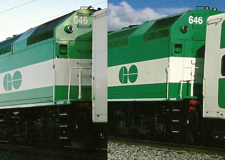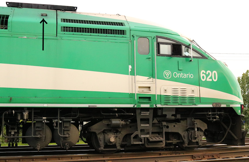 | Old Paint scheme has ONTARIO and TRILLIUM LOGO on front sides below cab windows New paint scheme has removed the Ontario name and Trillium logo and added METROLINX at the rear of the long hood both sides (Click Image Buttons to enlarge) | Ontario/Trillium Logos (Old Paint) ![]() | Metrolinx (New Paint/Repaints) ![]() | No Ontario/Trillium Logos![]() Also no logo on 607, 615, 647, 667-682 | GO662-GO643 Logo-less / Logos ![]() |