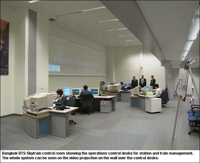 The system operates a standard 5-minute headway throughout the day, which is reduced to 3 minutes during the morning and evening peak period. Services start at 06:00 and end at 24:00 hrs. Some 33 of the 35 trains are required for the peak service. All operations are controlled from a single control centre which has an operations desk and an engineering desk. Operations can be viewed on a large projected wall screen, which is of good quality resolution.
