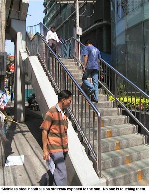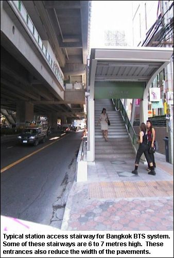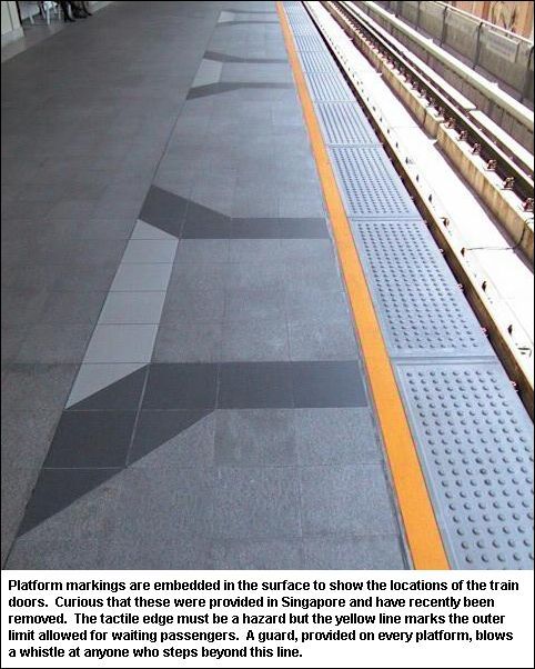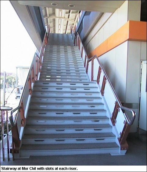The tropical heat and severe rain conditions lead to special requirements for station designs. Not least is the importance of good drainage to carry away rain water and the need to extend platform canopies far enough to protect waiting passengers from driving rain and the tropical sun. In the case of protection from sunlight, there are some problems as can be seen in the centre photo above, where passengers are forced to gather in a small area of shade to protect themselves from the direct sunlight. It is also interesting to see the handrails of all stairs and barriers are in unpainted stainless steel. This becomes very hot in direct sunlight and needs some sort of protection to allow it to be touched under these conditions.