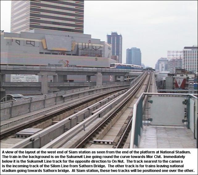 At Siam station, also called Central Station and where the two lines of the BTS system meet, a cross platform interchange arrangement has been built, involving the provision of two levels for platforms and tracks and the associated ramps for the routes into and out of the station. Each line, originally with both tracks at the same level, enters the platform area with one track above the other opposite the corresponding track of the other line. As the tracks leave the platform area, they begin a gradual return to the same level.