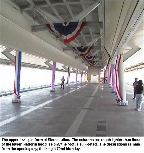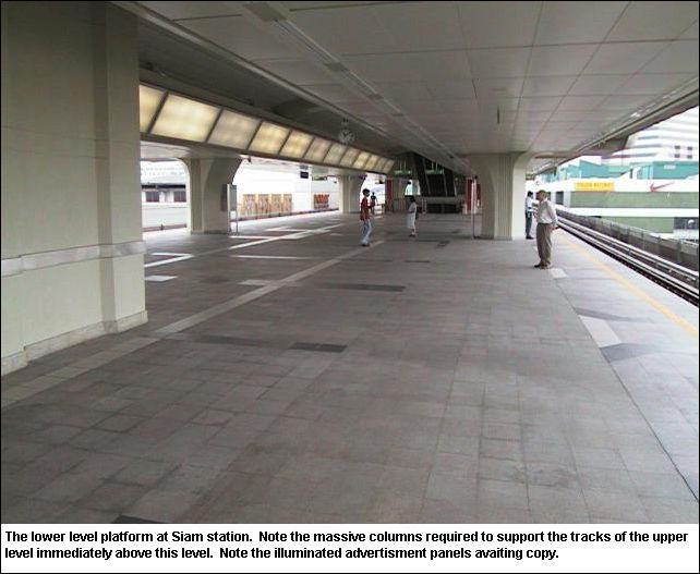 The different levels of Siam station are connected by stairs and escalators. There is a high level of interchange between trains on the same level and some between the two levels. The whole Siam structure is squeezed between the shopping centres on either side of Sukumvit road, with only about two metres clearance in some places. This also occurs at some of the other stations on the system. At some, the platform is level with roof gardens of apartments. One wonders how the residents feel about having a full-sized train set in their back gardens.