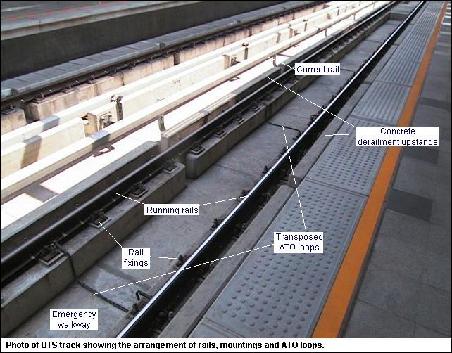 The stations are built with the tracks at a higher level than on the intermediate viaducts. This gives the line a "hump" profile, with the ramp up to each station assisting with train braking and the exit ramp down assisting with acceleration. Track is at standard 1435 mm (4 ft. 8½in.) gauge, fixed directly to concrete plinths on the guideway. There are also concrete upstands outside the rails to confine derailments. Traction current at 750 volts DC is transmitted to trains via an under-contact third rail, composed of aluminium with a steel contact surface. There are 10 traction substations on the system supplied through two bulk feeder stations at 25 kV AC. Each passenger station also has its own substation for local power supplies.