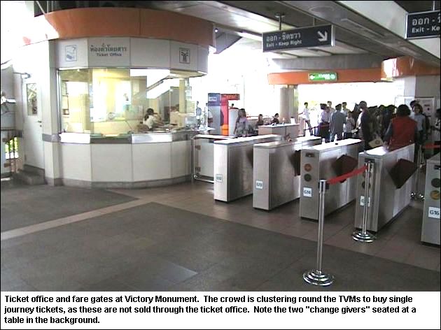 At many stations, a network of elevated footpaths and bridges connect with the mezzanine (see photo above) to give access to local adjoining streets. The mezzanine level leads to the ticket office, automatic ticket vending machines and the automatic faregates. The ticketing system uses plastic stored value tickets and these are offered for single journeys as well as stored value cards of up to 500 Baht. The TVMs sell only single journey tickets and only accept coins. Because of the demand for change, each ticket hall area has a table set out where young ladies are employed (see photo above) to provide change during the busier periods of the day. This appears to be a temporary arrangement.