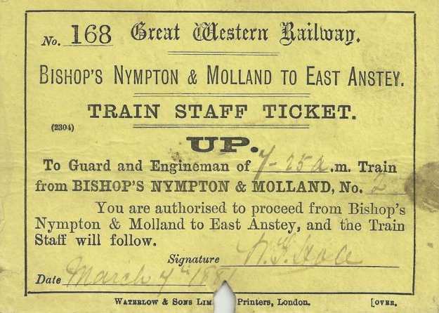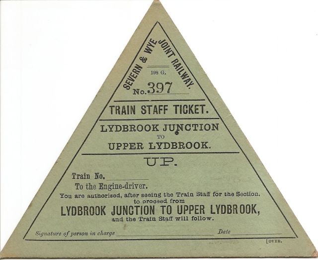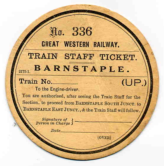From about the mid-1870s until the mid-1890s most (but by no means all) single-line block sections in the West Country were controlled by the "Train Staff and Ticket" (TS&T) method. There were a number of One Engine in Steam (OES) sections, mostly on goods-only lines, but some minor passenger branch lines reverted to that system in later years and it became quite common on 'rationalised' dead-end branches in British Railways (BR) days. Train staffs were usually made of wood or metal in a variety of styles and would be labelled with the identity of the section to which they applied (usually the names of the signal-boxes at each end of the section); any 'tickets' would be card or paper (occasionally metal) and pre-printed with the section details.