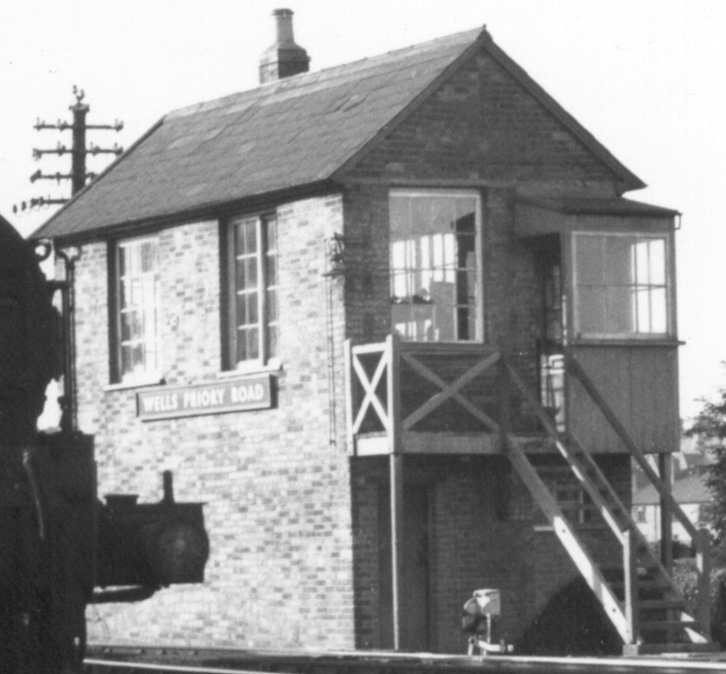 Each of the three stations had its own signal-box. It is believed that in early days these were called WELLS 'A' (at Priory Road), WELLS 'B' (at East Somerset) and WELLS 'C' (at Tucker Street), but eventually the 'B' box became known as "WELLS EAST SOMERSET" and the 'C' box became "WELLS TUCKER STREET". In 1896 the GWR ordered new nameplates (in its standard cast-iron style) for all three boxes using the new names, the one for the 'A' box reading "WELLS SOMERSET & DORSET BOX"; unusually that nameplate was positioned above the windows on the gable end nearest the station, rather than on the front wall, presumably so as to face GWR trains passing between the two GWR stations. Despite the name now displayed on the former 'A' box, the various surviving S&DJR signal diagrams still bore the legend "WELLS A" and usually the S&DJR called it simply "WELLS". (In a few S&DJR documents the location is mentioned as "Wells Junction", being a junction between GWR and S&DJR lines, but care should be taken not to confuse such references with the early Wells Branch Junction signal-box which once existed near Glastonbury.) For most of its life the 'A' box appears never to have displayed a nameboard on its front wall facing the S&DJR branch, but by early British Railways (BR) days the ex-GWR nameplate had been removed and replaced by a "WELLS PRIORY ROAD" nameboard on the front wall in a more conventional location below the windows (there is one indistinct photograph which suggests that both nameboards co-existed for a short period). Also in BR days the signal-box at Tucker Street was renamed "WELLS STATION" and fitted with a replacement pressed aluminium nameplate smaller than the GWR version.