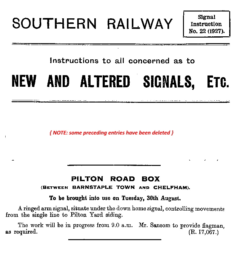 There is evidence from SR records that by 1927 there was an electric treadle located on the single line between the entrance to Pilton Quay siding and the level-crossing at Pilton Causeway, but there is no information available as to the date of its installation or what function, if any, it might have served relevant to the signalling at Pilton. Instead it is thought probable that in fact this treadle was relevant to the working at Barnstaple Town and may not have been installed until the SR period as described here.