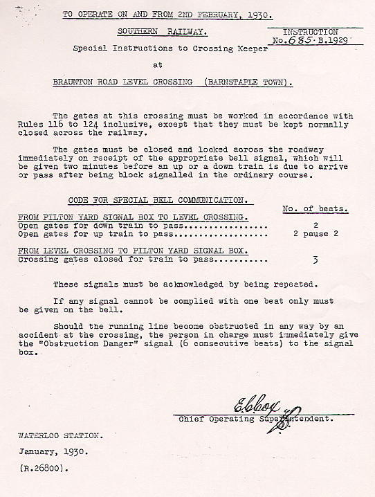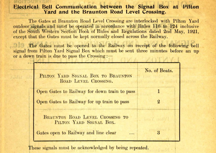 According to SR Signal Instruction No 4A of 1925, at that time the bell signals used between Pilton signal-box and the Braunton Road crossing-keeper were as shown in the table on the right. The Instruction required the Pilton signalman to send the appropriate code to the crossing-keeper three minutes before a train was due to pass over the level-crossing. However by 1930 the bell codes had been changed and the warning time reduced to two minutes - click here to read the later SR instructions (No 685.B.1929). |