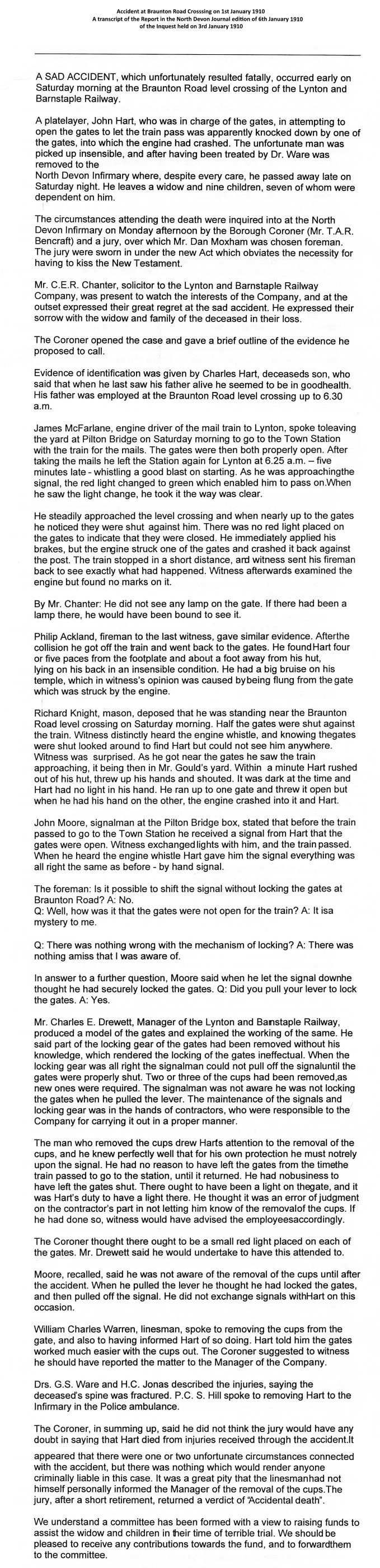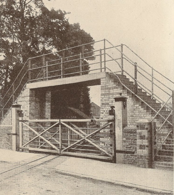 Gate Bolts. It is presumed, on the basis of available evidence and contemporary practice, that at both level-crossings the gates were bolted across the road by a 'gate bolt' lever in the lever-frame in the signal-box. It is not known for certain whether those levers bolted the gates across the road when the levers were in their 'normal' or their 'reverse' position, as both methods were used by different railway companies and signalling contractors. However in the light of comments at the Inquest into the fatal accident at Braunton Road crossing on 1-January-1910 (as reported by the North Devon Journal [1]), where the signalman is reported as saying that he had pulled his lever to lock the gates, then it is believed that the gate-bolts were effective when their levers were reversed. It is not known for certain also whether there was a separate bolt lever for each crossing or a single lever for both crossings, but the former is presumed as being 'usual practice'. There might have been occasional requirements to shunt out of the loop at the Barnstaple Town end, but without proceeding as far as Braunton Road crossing (eg in order to access the Quay siding in its original arrangement), which would have necessitated the gates at Braunton Road being closed unnecessarily if there was only one bolt lever.