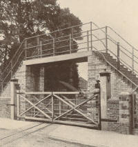 Pilton Causeway level-crossing was located immediately on the Town side of the signal-box and was equipped with a set of four wooden gates. Because the road was much wider than the railway the gates, which met in the middle when closed across the road, overlapped each other when closed across the railway as can be seen in the image on the right (click for larger view). The gates would have been worked by hand on the ground by the signalman and locked in position across the road by a lever in the signal-box lever-frame. Only when the gates were locked safely across the road would the lever-frame interlocking permit the signalman to clear any signals for the passage of trains over the level-crossing. There was a footbridge (Bridge No 4) over the line immediately on the Town side of the road, which was constructed originally with brick piers and wooden deck and stairs (as seen here); at some date prior to 1923 it was rebuilt with a reinforced concrete deck (designed by the British Reinforced Concrete Engineering Co Ltd) as seen in the image here. Curiously the ornate iron caps which adorned the main gate-posts bore the initials BWH&A of the nearby Bideford, Westward Ho! & Appledore Railway, which closed in 1917. |