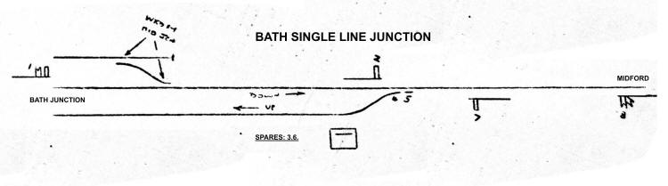 When the Bath Extension was opened in 1874 the block working on S&DJR single-line sections was by block telegraph without any train staff, and under the terms of the S&DR's 1874 undertaking to the Board of Trade (BoT) the first block-post south of Bath was supposed to be at Wellow. However it would appear from the evidence in the BoT Report on the disaster at Foxcote (near Radstock) in August 1876 that by that time intermediate block-posts existed at Bath Ticket Platform and Midford. Initially the start of the single-line section was controlled by Bath Junction box, but in 1874 that task transferred to the new Bath Single Line Junction box. It is probable that the new, short section of double track between Bath Junction and Bath Single Line Junction boxes was worked according to contemporary MR practice. The S&DJR Working Timetable (WTT) Appendix No 9 dated 1-February-1889 contained instructions relating to the use of 'disc signal' indicators in the two signal-boxes, and there is a mention therein of the 'block telegraph' between the two boxes.