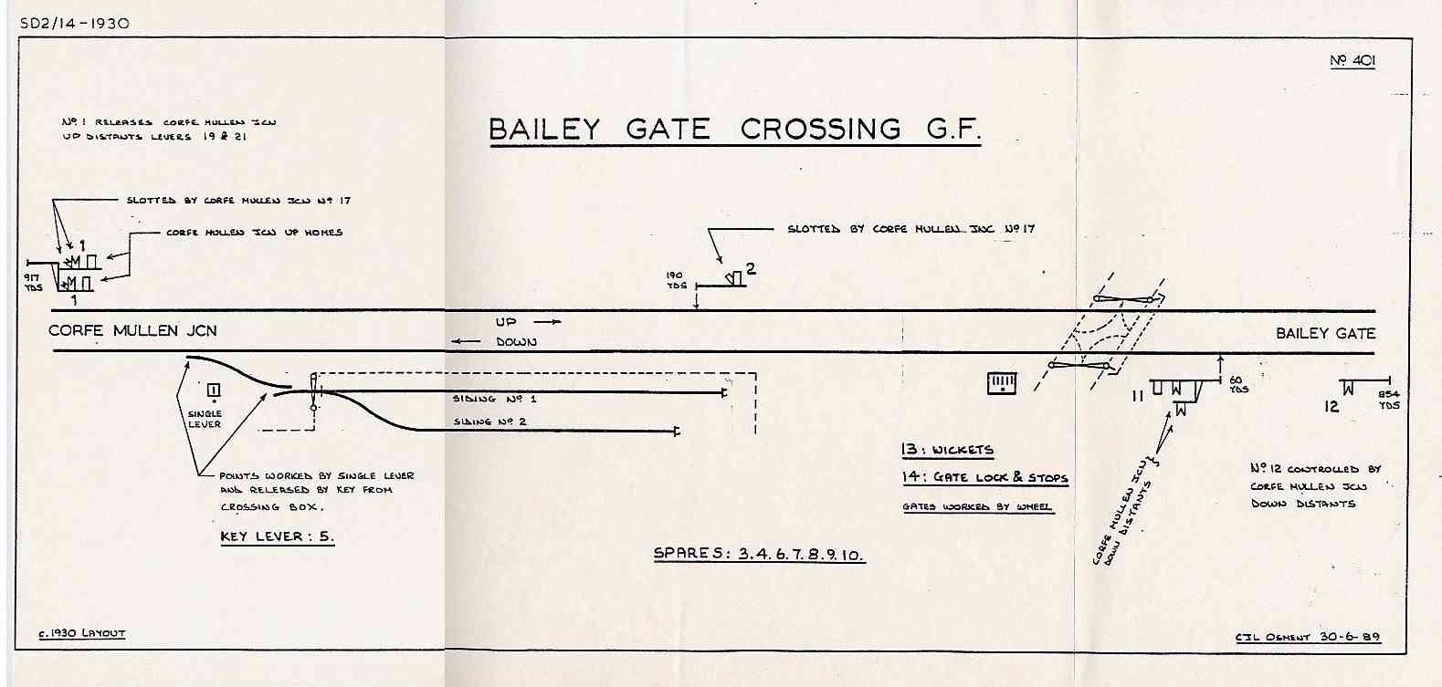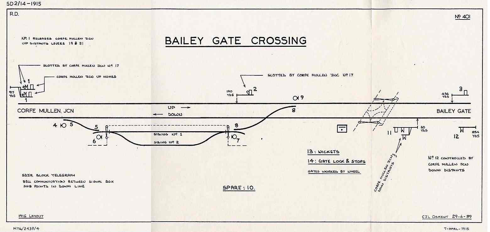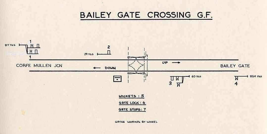 The southern part of the S&DJR had been constructed originally by the Dorset Central Railway (DCR) as a single-track line running northwards from Wimborne Junction. The first station north of Wimborne was at Bailey Gate and between those two stations there were three manned level-crossings:- Lake Crossing, Corfe Mullen Crossing and Bailey Gate Crossing itself. Bailey Gate Crossing was about half a mile south of Bailey Gate station, on the main road from Wimborne to Dorchester (later the A31), whilst the other two crossings were over minor roads. All three crossings were provided with resident crossing-keepers and some form of signalling, although only the latter two are believed to have had actual gate boxes.