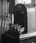 Stourpaine signal-box was equipped for 'switching-out' and the resulting SHILLINGSTONE - BLANDFORD 'long section' was worked by a pair of McKenzie & Holland (McK&H) 'square tablet' instruments installed in those two signal-boxes. These McK&H instruments were designed specifically for 'long section' working and they used square tablets to distinguish from the normal round tablets of the 'short' sections. This pattern of instrument was very rare in Great Britain and, apart from this solitary S&DJR section, only a few other sets on the Cambrian Railways are known. After all of the latter had been taken out of use then the S&DJR instruments remained as the only survivors until the abolition of Stourpaine signal-box and the S&DJR's only example of 'long section' ETT working in 1951. Photographic coverage of McK&H tablet instruments is very elusive and the only known picture of the S&DJR equipment shows the instrument at Blandford after it had been damaged by fire when the signal-box there was struck by lightning in 1906 (click picture for larger image). More details about the actual McK&H 'switching-out' process and its associated equipment can be found here in the RailWest page about Stourpaine box. |