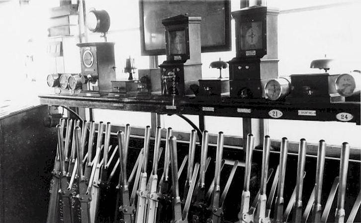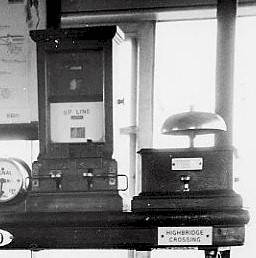 At Highbridge the S&DJR line to Burnham crossed the main line of the Great Western Railway (GWR) on the level and there was a connection between the two systems. Early block working arrangements at Highbridge are uncertain, but following the closure of Highbridge 'A' signal-box in 1914 double-line working was in force between Highbridge Loco (S&DJR) and Highbridge West (GWR) boxes. On this section the standard GWR Spagnoletti 'disc' block instruments were used, and those instruments certainly were still there in 1963. Those instruments were operated by two separate tapper keys, rather than by a rotary commutator, while the indications were given by twin flags which moved behind an aperture. Separate indicators for Up and Down lines were contained within the same case and it was GWR practice to paint the indicator face-plates white for 'Up' lines and green for 'Down' Lines. The photograph on the right shows the GWR Spagnoletti 'disc' block instrument inside Highbridge East 'C' signal-box (formerly known as Highbridge Loco) about 1963 (click the picture for a larger image of the signal-box interior). For a closer view of this type of instrument elsewhere on the S&DJR (although being used for a different purpose) click here for a picture of a similar Spagnoletti instrument in Highbridge East 'B' box in 1962. |