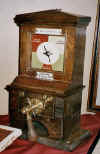 By the 1920s the standard method of working S&DJR double-line sections was described simply as 'Block Telegraph'. Records of the London & South Western Railway (L&SWR) show that by the beginning of 1923 the block telegraph system was in use throughout the double-track sections of the S&DJR main line from Midford to Templecombe No 2 Junction and from Blandford to Corfe Mullen Junction. Unfortunately most evidence about the actual equipment dates from after nationalisation in 1948, but the basic principle appears to have been the use of 3-position instruments operated by a sprung drop-handle. Each 'instrument' in fact consisted of two separate wooden cases containing the 'pegging' and 'non-pegging' portions; the cases were identical, but only the pegging portion had the drop-handle. The picture on the right shows a typical 'pegging' S&DJR Block Telegraph instrument (on show at an exhibition) - click the picture to see a larger image. [Note: in earlier years it appears that the 'non-pegging' instruments also had drop-handles in order to allow the sending or acknowledging of 'dial signals', but these were removed in later years.] |