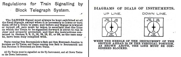 The S&DJR Block Regulations introduced in 1886 were still in use in 1889, but thereafter unfortunately there is a gap in available archive material until the 1905 Working Time Table (WTT) Appendix. By that time the bell codes had changed to more modern versions and the 'dial signals' appear no longer to form a integral part of block working, although they were still in use for some purposes. Even as late as 1914 the WTT Appendix contained the following Regulation:-