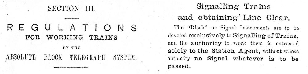 In 1864 the S&DR issued a Rule Book which included a set of "Regulations for Working Trains by the Absolute Block Telegraph System" (click here to see an extract), from which it is clear that the railway was worked purely by 'block telegraph' without any form of physical 'train staff' and that the 'block telegraph' instruments were separate from the ordinary 'single needle telegraph' used for normal messaging. A system of 'crossing orders' was also in use, controlled by a 'crossing agent' located in the S&DJR offices at Glastonbury (subsequently moved to Bath), but this system existed mainly to regulate the movements of trains (eg those crossing out-of-course) and it would appear that it was not part of the actual block working system (click here to see an extract from the 1864 Rule Book).